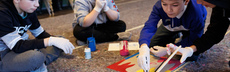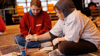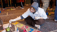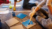 "Schön war es zu sehen, wie jede Schüler:in den eigenen Rhythmus für die Umsetzung der Skizzen auf die Fliesen fand. Es gab Schüler:innen, die am Ende eine einzige Fliese entwickelt hatten und andere, die einzeln oder in Gruppen bis zu 15 Fliesen bearbeitet hatten. Zum Ende des Tages gelangten wir beinahe in eine Art Fliesbandarbeit. Wenn es darum ging, dass noch fünf rote, drei blaue und eine grüne Fliese fehlten, gingen die Finger der Freiwilligen hoch und diese doch ein wenig monotone, aber für unser Gesamtwerk wichtige Arbeit wurde sofort erledigt."
